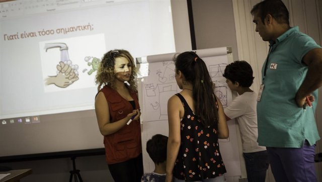 organizaciones Melissa y Littlepugad visita Educational Health Station (EHS) de Cruz Roja en Atenas para recibir consejos sobre cómo prevenir enfermedades y otras cuestiones relacionadas con la higiene y la salud. No paran de moverse, van de un lado al otro de la sala, como si el calor del verano hiciera más impaciente esa larga espera hasta poder abrazar a sus familiares.