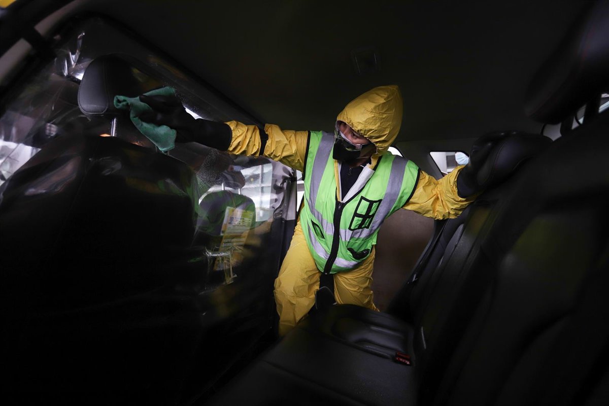 Una persona desinfecta un taxi a las puertas del Aeropuerto Internacional El Dorado, en Bogotá, Colombia. - JHON PAZ / XINHUA NEWS / CONTACTOPHOTO