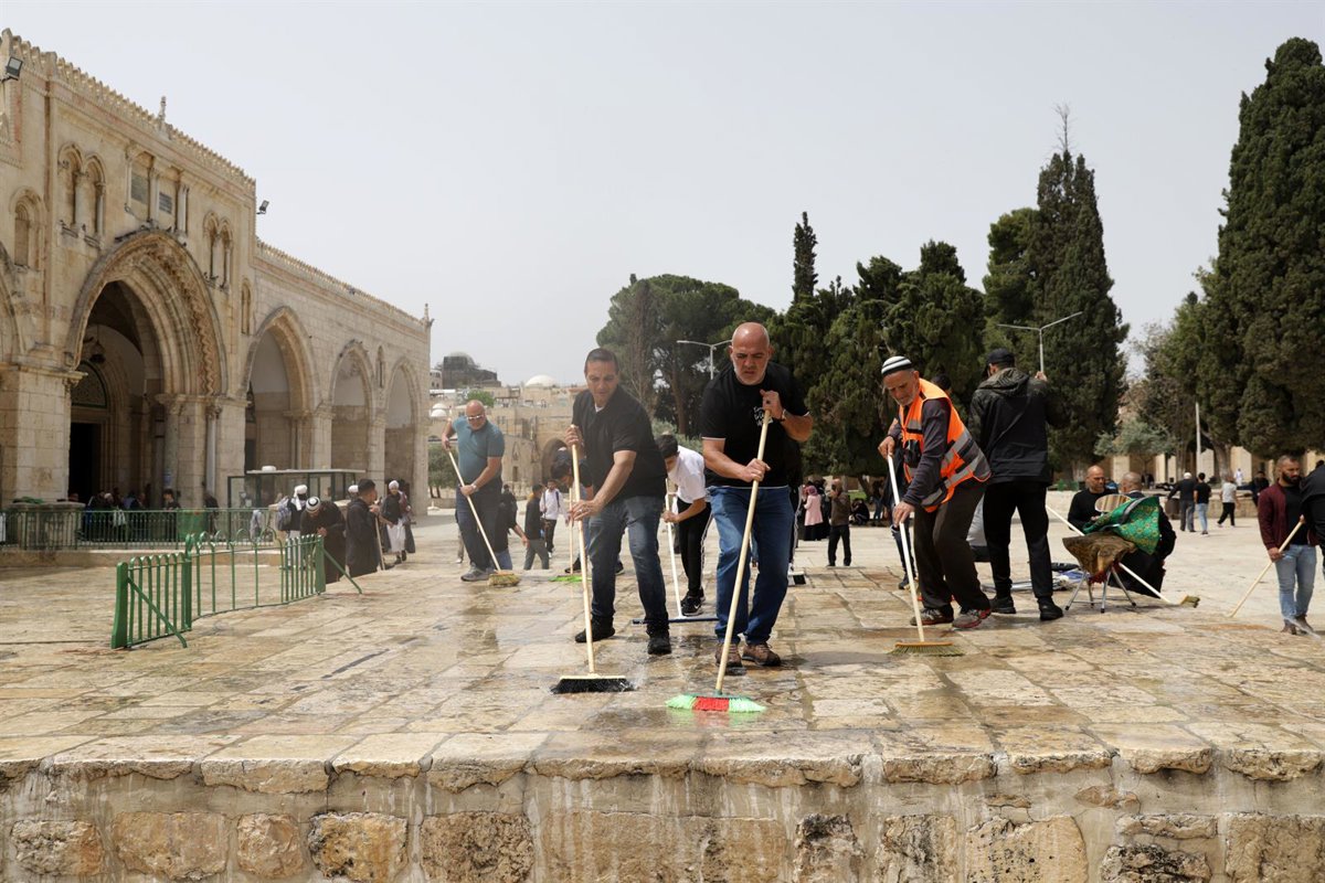 17 April 2022, Israel, Jerusalem: Palestinians clean Al-Aqsa mosque following clashes with Israeli security forces in Jerusalem's Old City. Photo: Jeries Bssier/APA Images via ZUMA Press Wire/dpa - Jeries Bssier/APA Images via ZUM / DPA