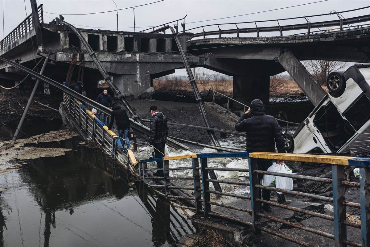 Varios civiles cruzan por el puente bombardeado en Irpin, a 2 de marzo de 2022, en Irpin (Ucrania). El frente ucraniano ha decidido bombardear dicho puente al tratarse de la vía directa que tiene el kilométrico convoy ruso, que viene desde Bielorrusia, - Diego Herrera - Europa Press