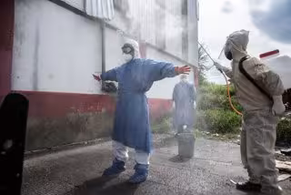 Un trabajador de una ambulancia se desinfecta por el coronavirus en México. - Hector Adolfo Quintanar Perez/ZU / DPA