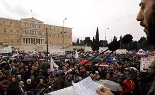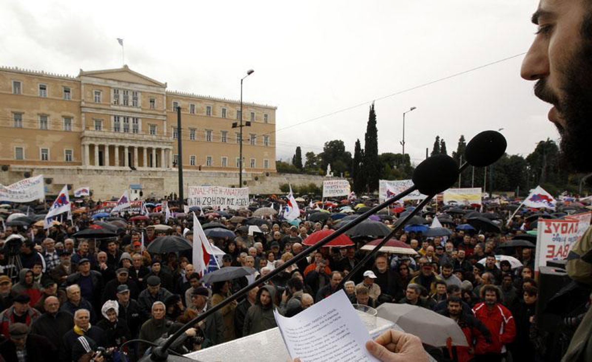 Unos 5.000 miembros del sindicato del sector público ADEDY se congregaron frente al Parlamento acusando a los políticos de "traidores" y con pancartas en las que advertían: "Nosotros no pagaremos la crisis". Los antidisturbios utilizaron brevemente gas lacrimógeno para reducir a los manifestantes que intentaron cruzar un cordón de seguridad.