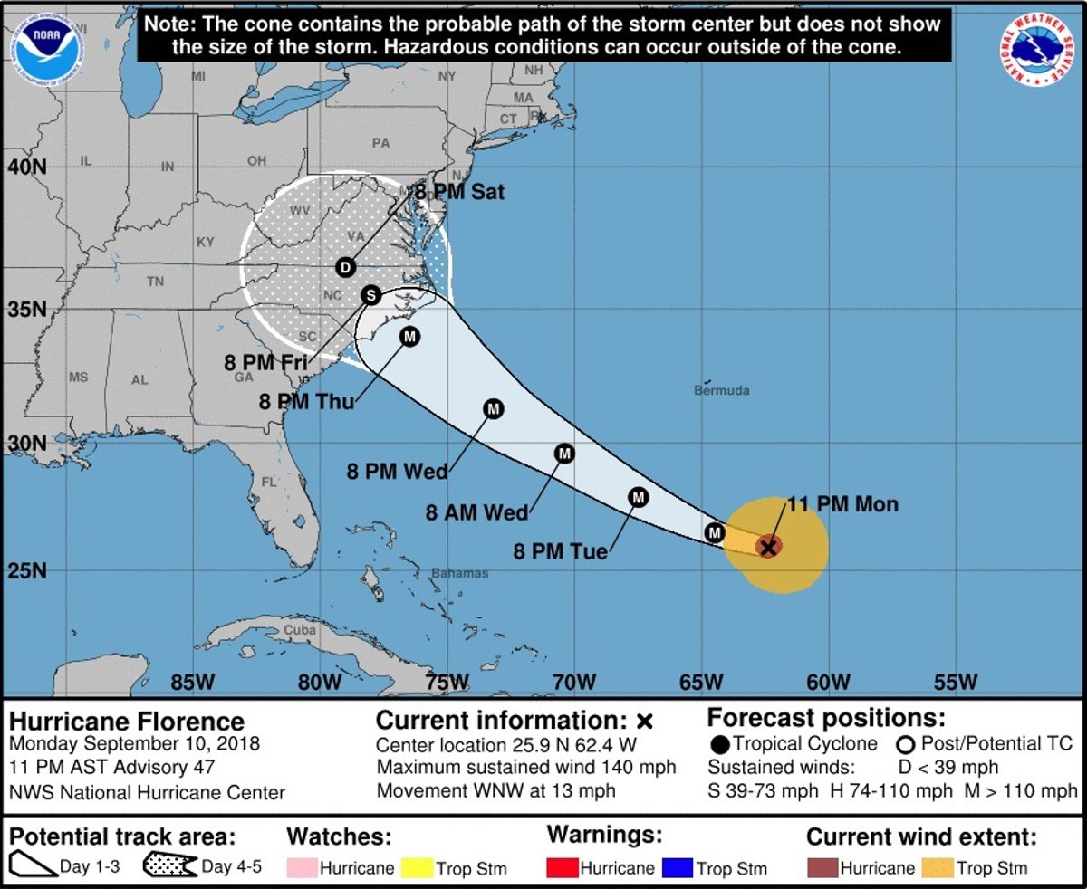 El portavoz del CNH Dennis Feltgen ha hecho hincapié en que los efectos de 'Florence', se sentirán en una extensa región. Los vientos se extenderán unos 482 kilómetros (300 millas) a lo largo de los tres estados.