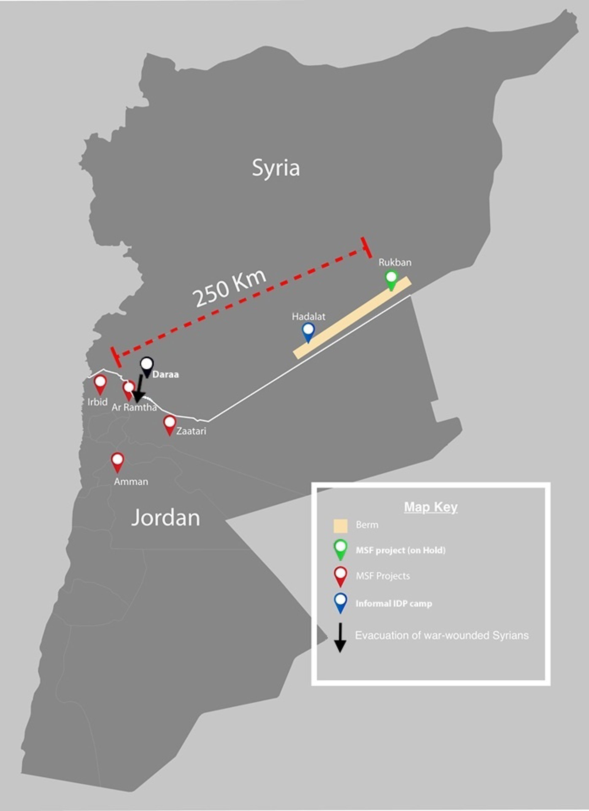 Médicos Sin Fronteras ha advertido también de la complicada situación que sufren los heridos de guerra que están en el otro extremo de la frontera entre Siria y Jordania, a más de 250 kilómetros al oeste del Berm, que ven cómo se les sigue denegando el acceso al programa de cirugía de emergencia de MSF en la ciudad jordana de Ramtha.