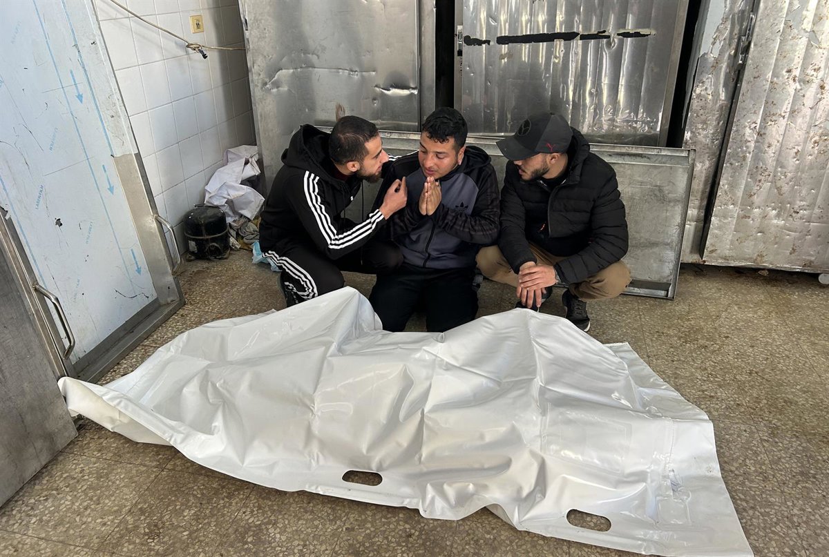 Palestinos junto al cadáver de un hombre muerto por disparos del Ejército de Israel en el campamento de refugiados de Al Bureij, en el centro de la Franja de Gaza, pese al alto el fuego en vigor desde el 10 de octubre de 2025 (archivo) - Europa Press/Contacto/Ahmed Ibrahim