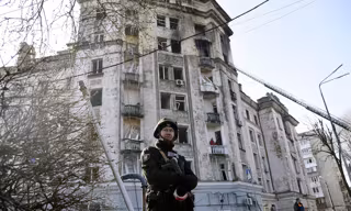 Soldado ucraniano frente a un edificio de viviendas en Keiv afectado por un bombardeo ruso. - Europa Press/Contacto/Ruslan Kaniuka