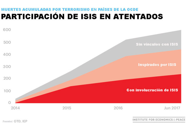 El grupo que lidera Abu Bakr al Baghdadi ha sido el artífice además de que el número de ataques en países desarrollados se haya incrementado del 67 por ciento ene l número de ataques y casi un 600 por ciento en el de muertos desde 2014. No obstante, aclara el informe, solo tres atentados sumaron el 44 por ciento de las muertes entre 2014 y junio de 2017: los atentados de París de noviembre de 2015 (con 137 muertos), el de Niza de julio de 2016 (87) y el del club de Orlando (50).