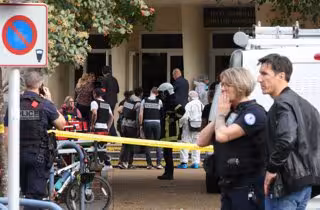 13 October 2023, France, Arras: French police officers from the forensic service stand outside the Gambetta high school. - Denis Charlet/AFP/dpa