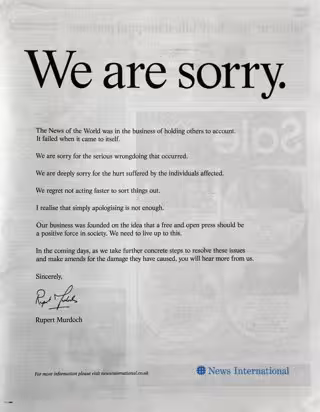 El presidente de News Corporation, Rupert Murdoch, ha escrito una disculpa personal por los posibles daños que haya podido causar el escándalo de las escuchas ilegales protagonizado por el diario extinto 'News of the World' y ha sido publicada en todos los periódicos británicos este fin de semana bajo el titular 'Lo sentimos'.