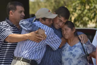 Al momento de salir del centro hospitalario, el pescador alzó su mano en señal de victoria y mostró una sonrisa abrazado a sus padres.