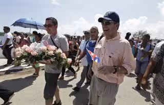 Más de un centenar de personas, incluyendo muchos niños, les recibieron en el puerto de Cojimar. Tras atracar su yate, los nietos de Hemingway visitaron el monumento a su abuelo y depositaron unas flores.