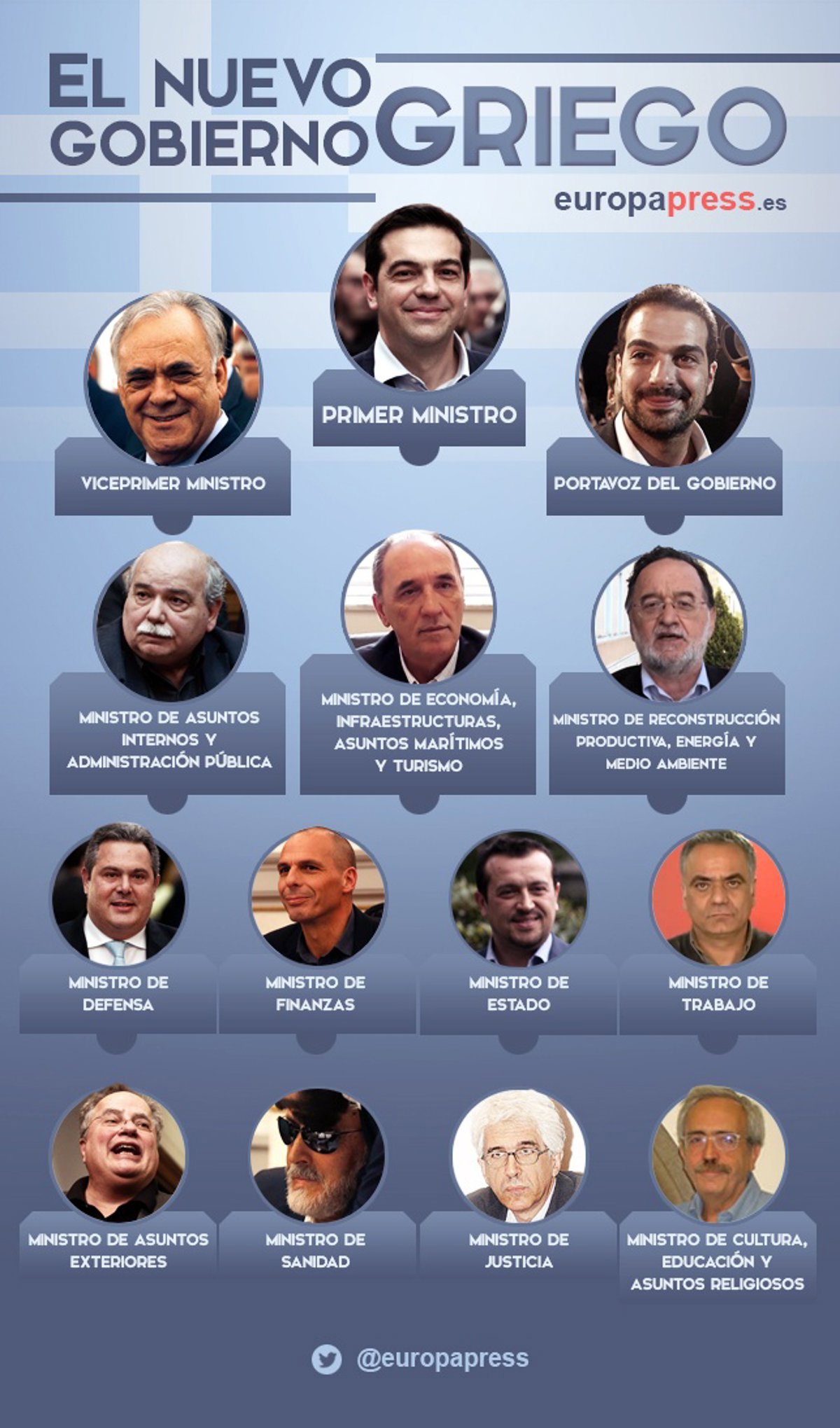 Este martes se han anunciado por fin los miembros del nuevo gobierno de Grecia. El primer ministro griego y líder de SYRIZA, Alexis Tsipras, ha desvelado el que será su equipo en esta legislatura, incluyendo tres 'superministros' y ninguna mujer.