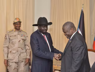 Archivo - Mohamed Hamdan Dagalo observa un saludo entre Salva Kiir y Riek Machar - PRESIDENCIA DE SUDÁN DEL SUR - Archivo
