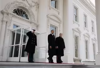 Obama llegó acompañado del presidente saliente, George W. Bush, con el que había desayunado previamente en la Casa Blanca, en el protocolario café del 'Día de la Inauguración', en compañía de sus respectivas esposas, Michelle y Laura.