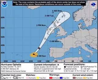 El huracán 'Ophelia', de categoría 2 en la escala Saffir-Simpson, se encuentra en estos momentos a medio camino de las islas Azores y la península Ibérica y llegará el lunes a las islas Británicas transformado ya en tormenta tropical, aunque generando vientos huracanados.