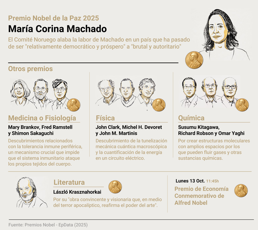 El Comité Noruego ha reconocido este viernes con el premio Nobel de la Paz a la opositora venezolana María Corina Machado, por su "incansable esfuerzo" para promover los derechos y libertades en Venezuela y favorecer una transición "justa y pacífica" de "la dictadura a la democracia".