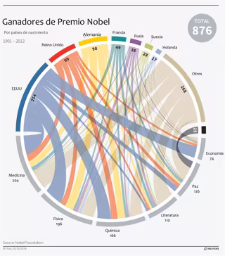 El cuarto en este particular ránking sería Francia, ya a cierta distancia, con 49 premios Nobel, justo delante de Suecia (28) y Rusia (38).