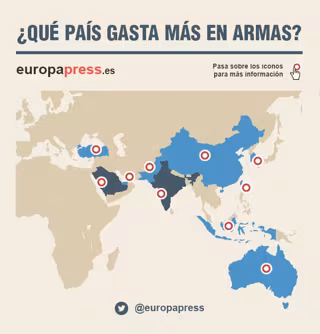 El siguiente país en la clasificación es India, que en 2014 gastó en armas 5.570 millones de dólares --5.269 millones de euros--. Tras éste se sitúan China, cuyo gasto en armamento fue de 2.600 millones de dólares --2.459 millones de euros--; Emiratos Árabes Unidos (2.210 millones) y Taiwán (2.160 millones).