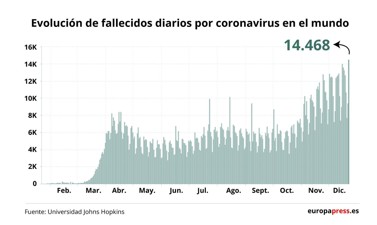 La pandemia del nuevo coronavirus ha registrado en las últimas 24 horas más de 646.000 casos nuevos y 14.468 muertos, con lo que bate el récord diario de decesos y eleva el total a más de 78 millones de contagios y 1,71 millones de víctimas morales, según el balance publicado este miércoles por la Universidad Johns Hopkins.
