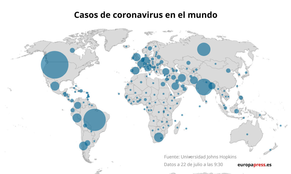 La pandemia del nuevo coronavirus originado en la ciudad china de Wuhan ha registrado en las últimas 24 horas 279.700 nuevos casos, su nuevo récord diario, lo que eleva el balance a más de 15 millones de personas contagiadas y más de 623.000 víctimas mortales, según el balance global publicado este jueves a las 9.30 horas por la Universidad Johns Hopkins.
