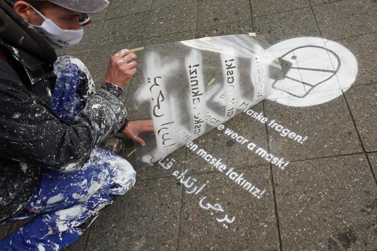 Un hombre pinta un mensaje para recordar la obligación de uso de mascarilla en Berlín - Jrg Carstensen/dpa