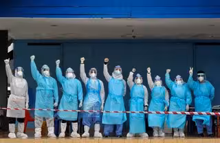 Trabajadores saniarios saludan antes de comenzar su turno en un centro de test de coronavirus en Kampung Gersik, en Malasia - Muqtadir Halim/BERNAMA/dpa