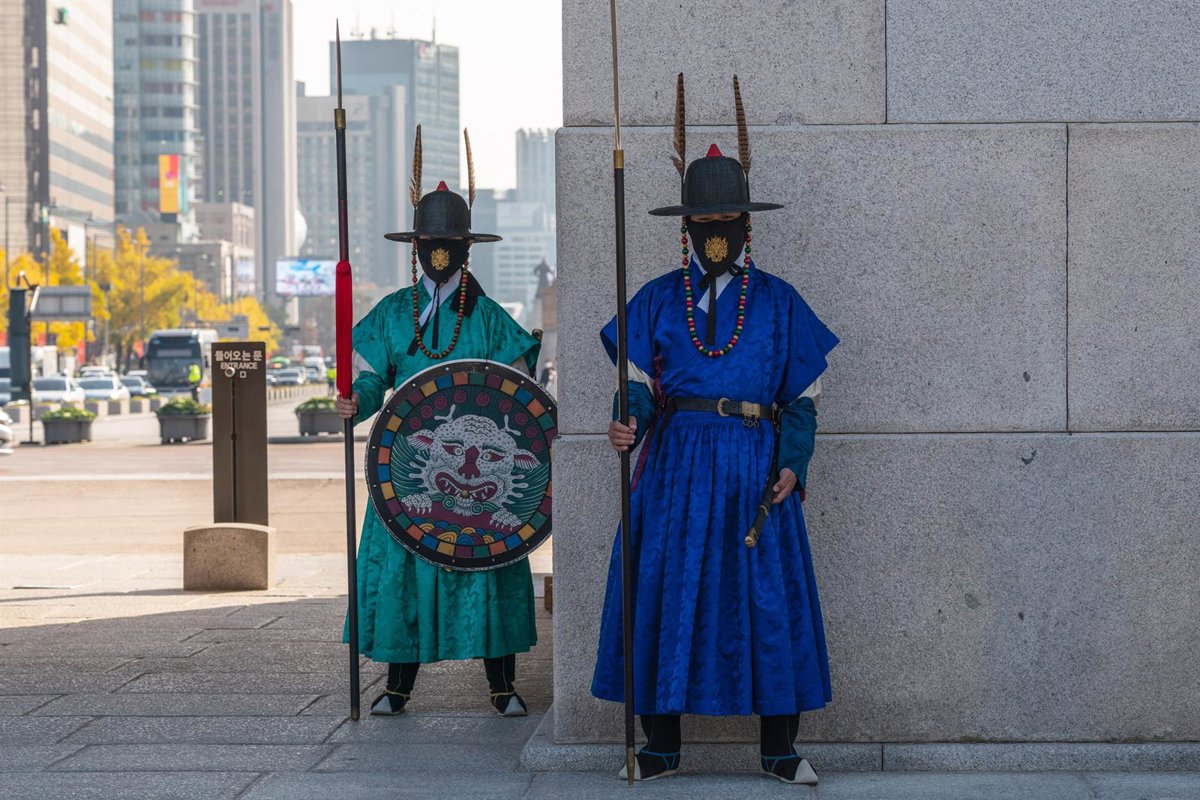Dos guardias reales con mascarilla en la puerta principal del Palacio Gyeongbokgung, en Seúl - Simon Shin/SOPA Images via ZUMA / DPA
