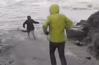 Las fuertes olas sorprenden a los 3 paseantes y el jubilado, de 75 años según la descripción en YouTube, cae, siendo arrastrado por el oleaje mar adentro. Su esposa, de 76 años, corre tras él para rescatarle, y detrás de ella emprende la carrera el fotógrafo.