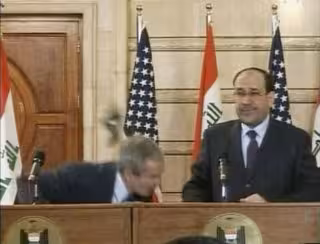 Un periodista iraquí llamó "perro" en árabe (Un insulto grabe) a Bush y después le lanzó sus zapatos durante una rueda de prensa conjunta con el primer ministro iraquí, Nuri al Maliki. Efectivos de las fuerzas de seguridad iraquíes y del servicio secreto estadounidense saltaron de inmediato sobre el periodista y se lo llevaron a rastras de la sala mientras forcejeaba.