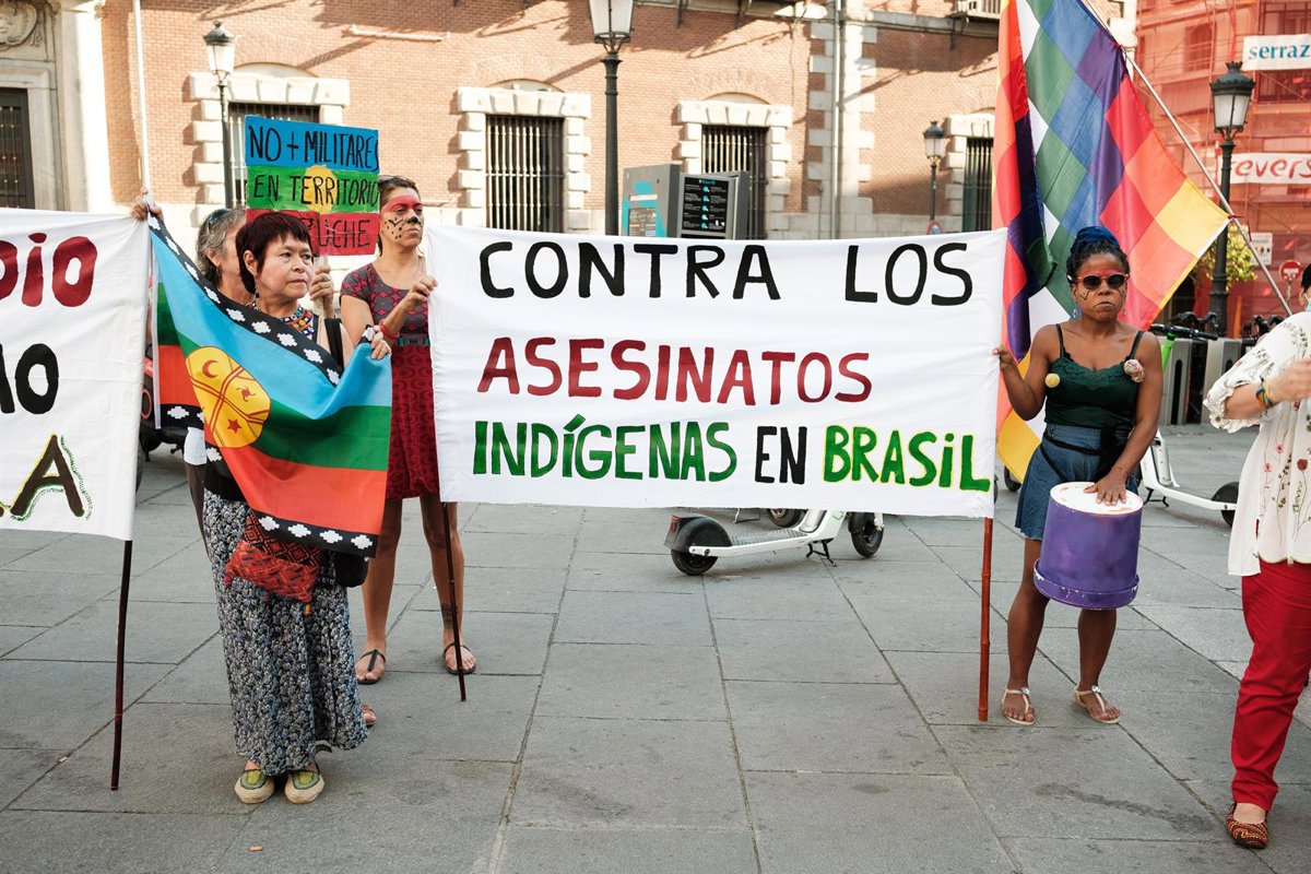 Archivo - Manifestantes sostienen una pancarta durante una protesta en demanda de justicia para los indígenas asesinados en Brasil celebrada en la plaza de las provincias de Madrid. - Europa Press/Contacto/Atilano Garcia - Archivo