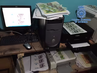 Los cinco detenidos, entre ellos el líder del grupo, son de nacionalidad colombiana. La imprenta para copiar los billetes contaba con siete impresoras y todos los útiles necesarios para la falsificación de distintas monedas, tales como hologramas, hilos de seguridad, tintas o papel y llegaban a alcanzar una importante capacidad de producción.