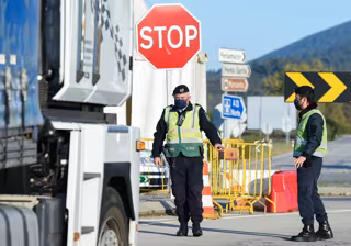 Agentes de policía trabajan en un control en un punto fronterizo entre Portugal y España, a 5 de abril de abril de 2021, en Zarza la Mayor, Cáceres, (España). - Gustavo Valiente - Europa Press