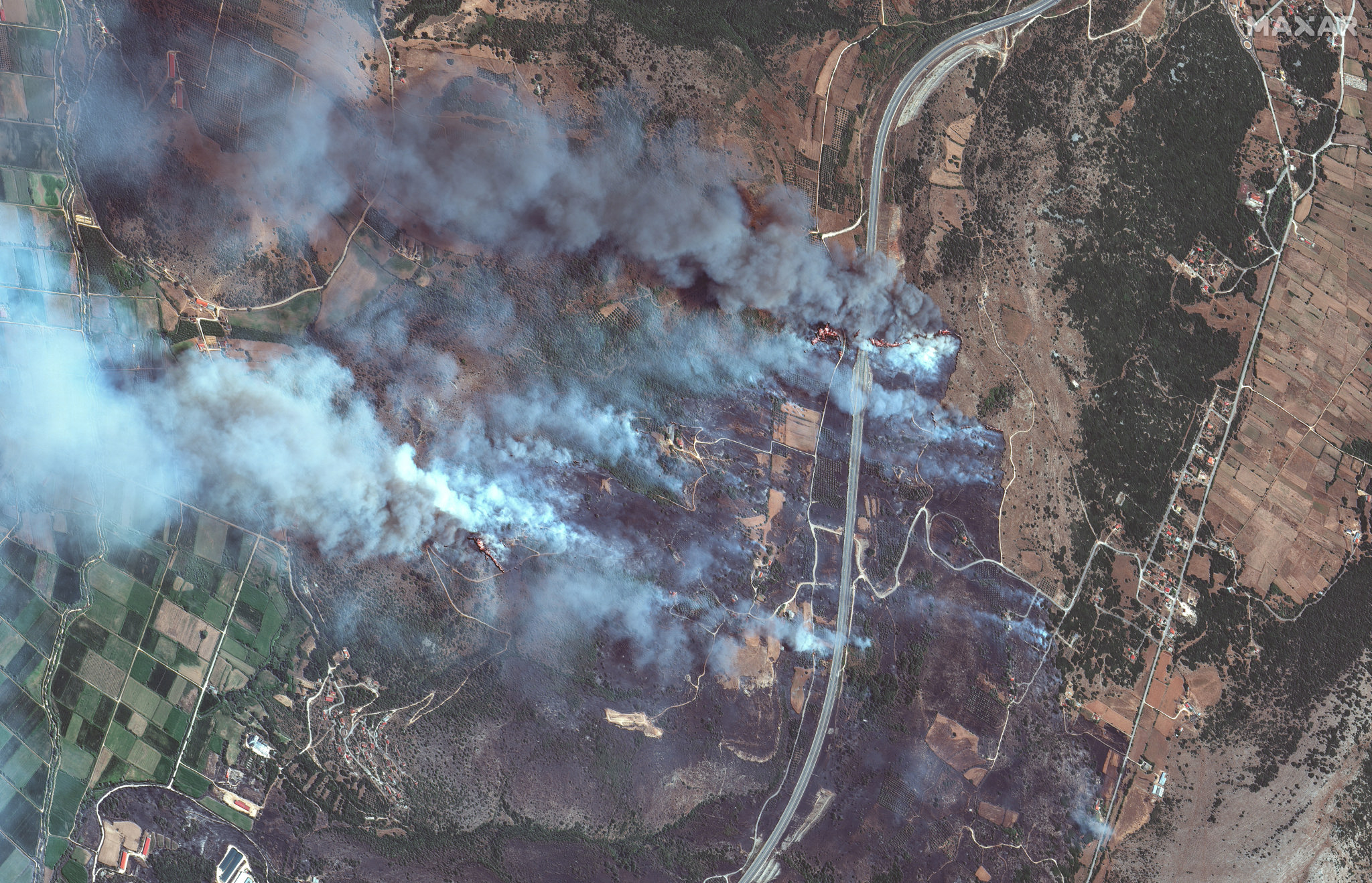 Vista general de los incendios forestales en la isla de Quíos, Grecia (imagen de Maxar) - Satellite image ©2025 Maxar Technologies