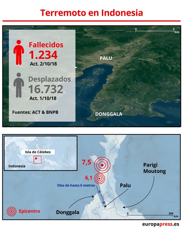 La agencia de gestión de emergencias (BPND) ha confirmado la muerte de al menos 1.234 personas como consecuencia de los seísmos --el más fuerte de una magnitud de 7,5-- y por un tsunami que arrasó la costa de la ciudad de Palu con olas de hasta seis metros.