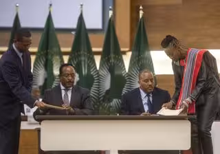 Archivo - El asesor de Seguridad Nacional etíope, Redwan Hussien Rameto (segundo por la izquierda), firma con el portavoz del TPLF, Getachew Reda (segundo por la derecha), el acuerdo de paz de Tigray en Pretoria (Sudáfrica) - ALET PRETORIUS / XINHUA NEWS / CONTACTOPHOTO