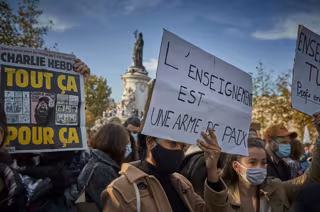 Manifestación en homenaje al profesor de Historia decapitado en un atentado islamista a las afueras de París por mostrar en clase caricaturas de Mahoma - 2020 GETTY IMAGES / KIRAN RIDLEY