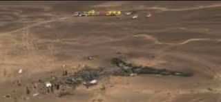 Las imágenes del vídeo comienzan con una vista aérea del lugar del accidente en las que se puede apreciar el avión casi totalmente destruido y quemado en medio del desierto, dejando una silueta en la tierra con la forma del avión.