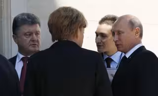 "Durante el almuerzo por el 70 aniversario del Desembarco de Normandía de los aliados en el 'Día-D', el presidente Putin ha mantenido una breve conversación con François Hollande, Angela Merkel y Petro Poroshenko", ha indicado Peskov.
