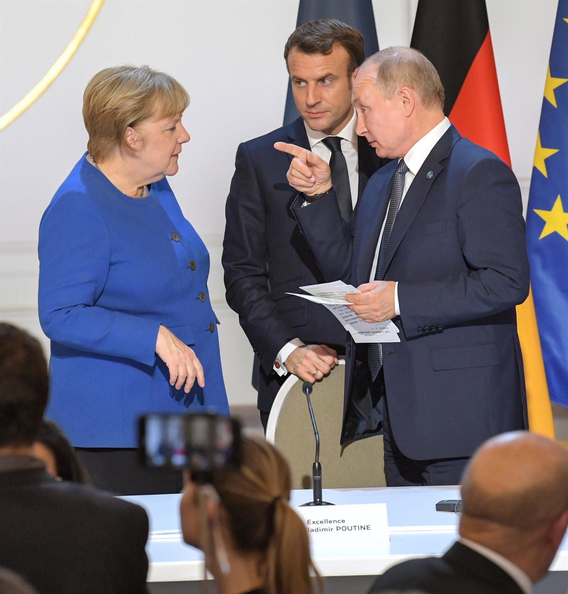 Imagen de una reunión entre el presidente de Rusia, Vladimir Putin, la canciller alemana, Angela Merkel, y el presidente de Francia, Emmanuel Macron. - Dmitry Azarov - Archivo