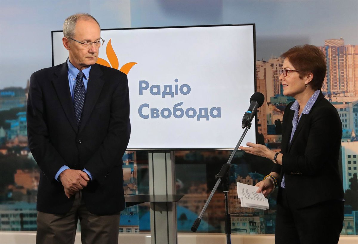 La Embajadora Extraordinaria y Plenipotenciaria de los Estados Unidos en Ucrania, Marie Yovanovitch, pronuncia un discurso en presencia del Editor Jefe de Programación de la RFE/RL, Nenad Pejic, el 10 de octubre de 2018. - UKRINFORM / CONTACTO