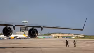 Dos militares de EEUU en la pista del Aeropuerto Internacional de Puerto Príncipe, en Haití, frente a un avión que transportaba suministros para el campamento que se está construyendo para la Policía de Kenia - Europa Press/Contacto/Jose A. Iglesias