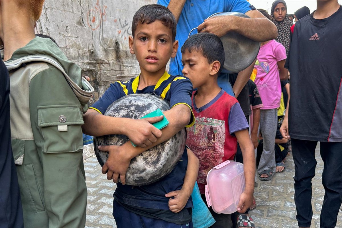 Archivo - Niños palestinos hacen cola para recibir comida en la Franja de Gaza, en medio de los ataques de Israel. - Europa Press/Contacto/Hasan Alzaanin - Archivo