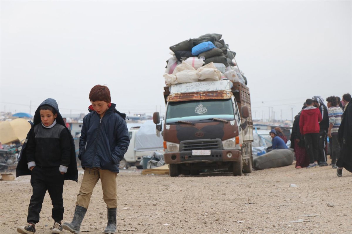 Archivo - Dos niños caminan mientras a su espalda se prepara un convoy de personas para abandonar el campo de Al Hol, en la provincia siria de Hasaka, en el noreste del país - Europa Press/Contacto/Stringer - Archivo