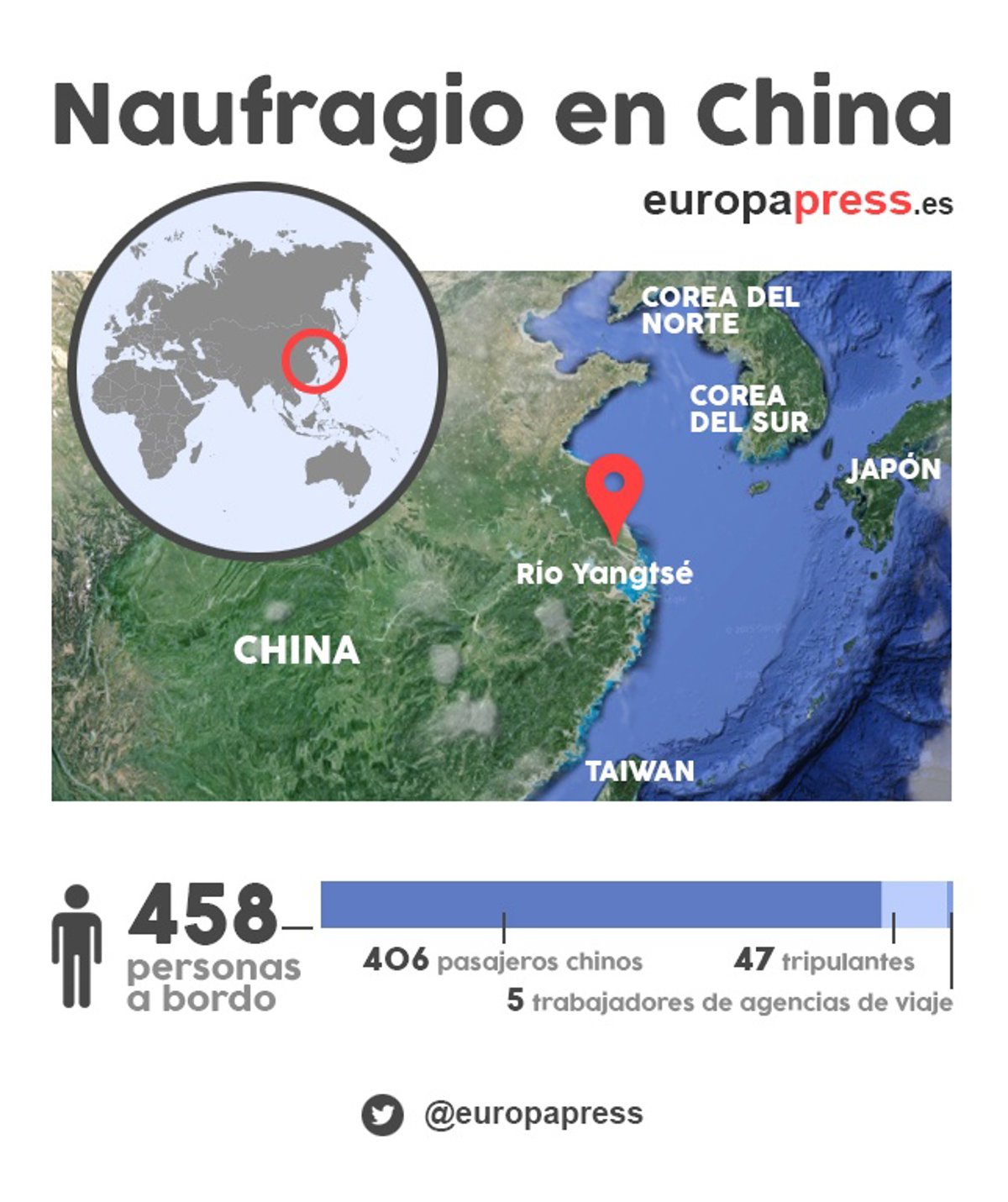 El naufragio podría ser el siniestro naval más grave registrado en China en los últimos 70 años. Los equipos de rescate y los buzos han logrado sacar en las últimas horas a cinco personas con vida del interior del casco del barco hundido, incluida una mujer de 65 años de edad.