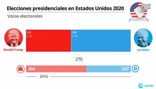 A continuación puedes seguir en varios gráficos el recuento en directo de las elecciones presidenciales estadounidenses. Este gráfico muestra el número de electores totales que consigue cada uno de los candidatos (uno de ellos debe llegar a 270 para ganar la presidencia):