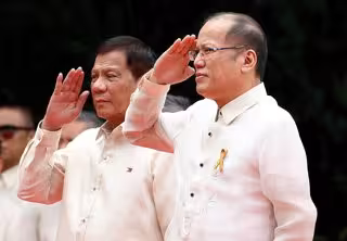 Duterte, el demimosexto presidente de Filipinas, se ha reunido con Aquino, a quien se le han entregado los honores de salida del Gobierno, antes de comenzar la ceremonia, en los jardines del palacio.