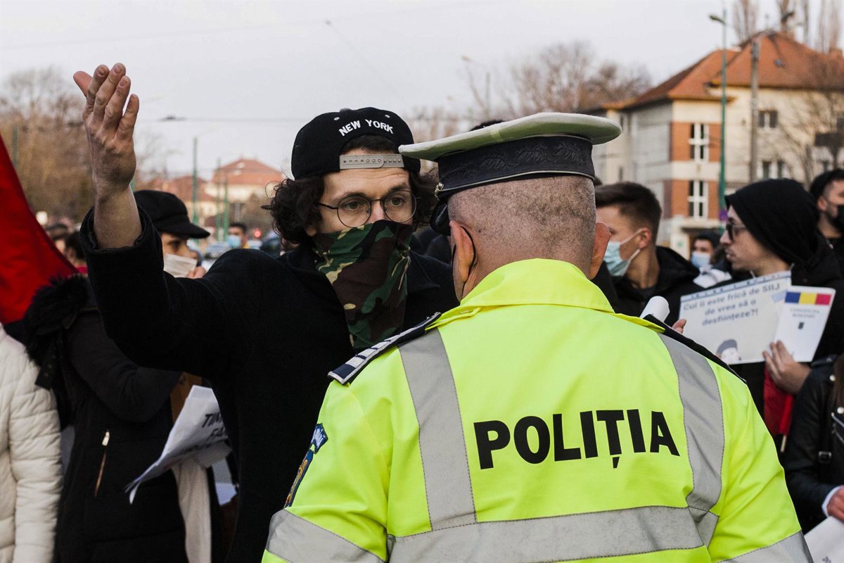 Archivo - Un hombre se enfrenta a la Policía durante una protesta contra las restricciones por la COVID-19 en Timisoara, en Rumanía. - Cornel Putan/ZUMA Wire/dpa - Archivo