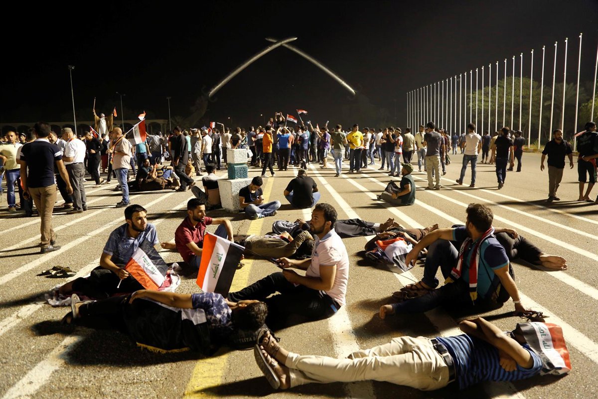 Tras caer la noche, los manifestantes han levantado tiendas de campaña junto a los arcos del triunfo de espadas cruzadas sostenidas por unas manos hechas a imagen de las del dictador Sadam Huseín, derrocado tras la invasión estadounidense de 2003.