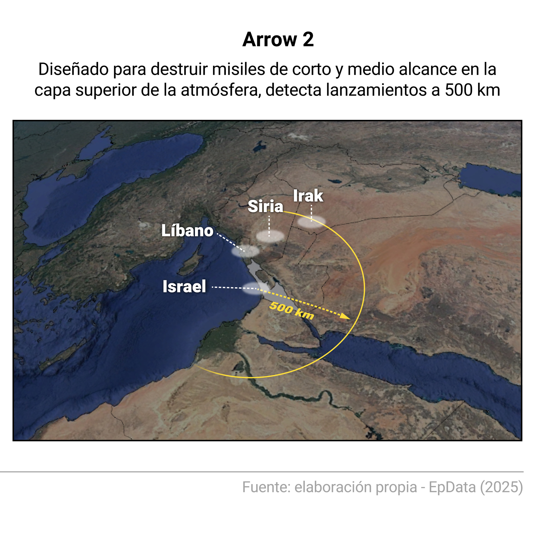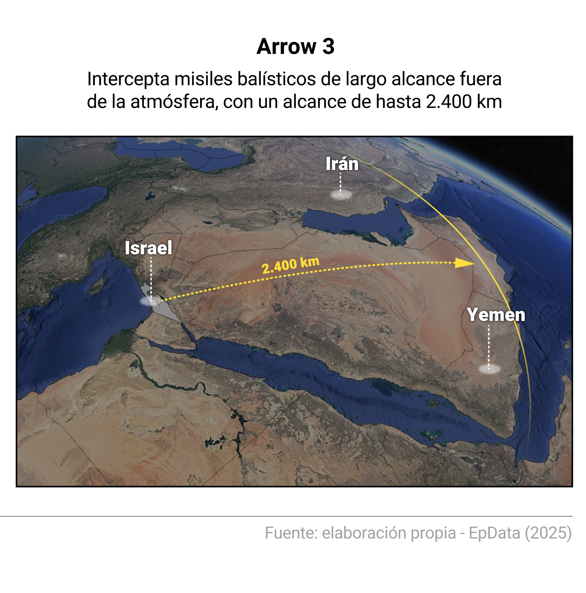 Mientras tanto, 'Arrow 3' --desarrollado por Israel Aeroespace Industries con apoyo de la estadounidense Boeing-- está diseñado para interceptar misiles balísticos de largo alcance en el punto máximo de su arco, fuera de la atmósfera terrestre, con un rango de 2.400 kilómetros. Este sistema fue usado por primera vez en 2023 para destruir un misil lanzado por los rebeldes hutíes desde Yemen.
