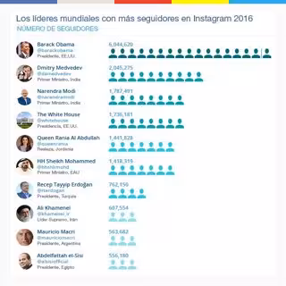 El presidente de Estados Unidos, Barack Obama, ostenta la primera posición de la clasificación de líderes mundiales más seguidos: más de seis millones de personas están atentas a las imágenes que publica. Tras él, aunque a una distancia considerable, se sitúa el primer ministro ruso, Dmitri Medvedec, que tiene dos millones de seguidores.